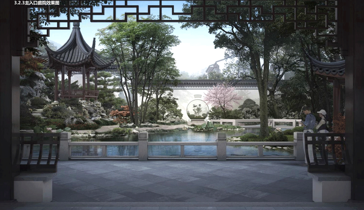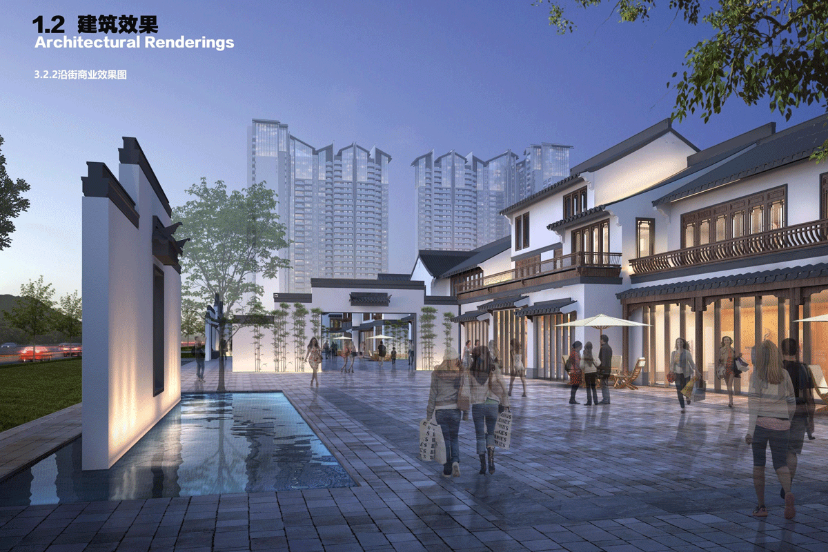 商业街区以“园林化”为主题,同样由三个着落点构成:中式商业空间、意境景观、园林式商业。
