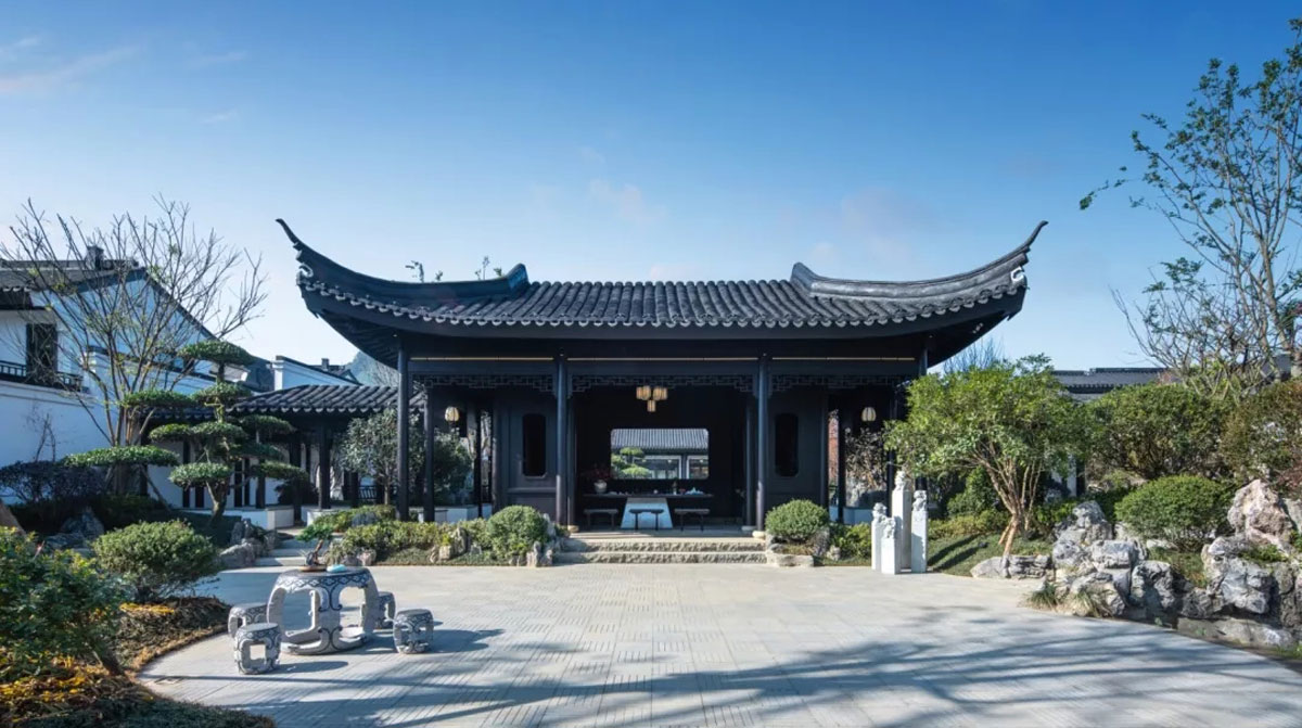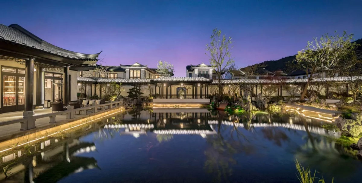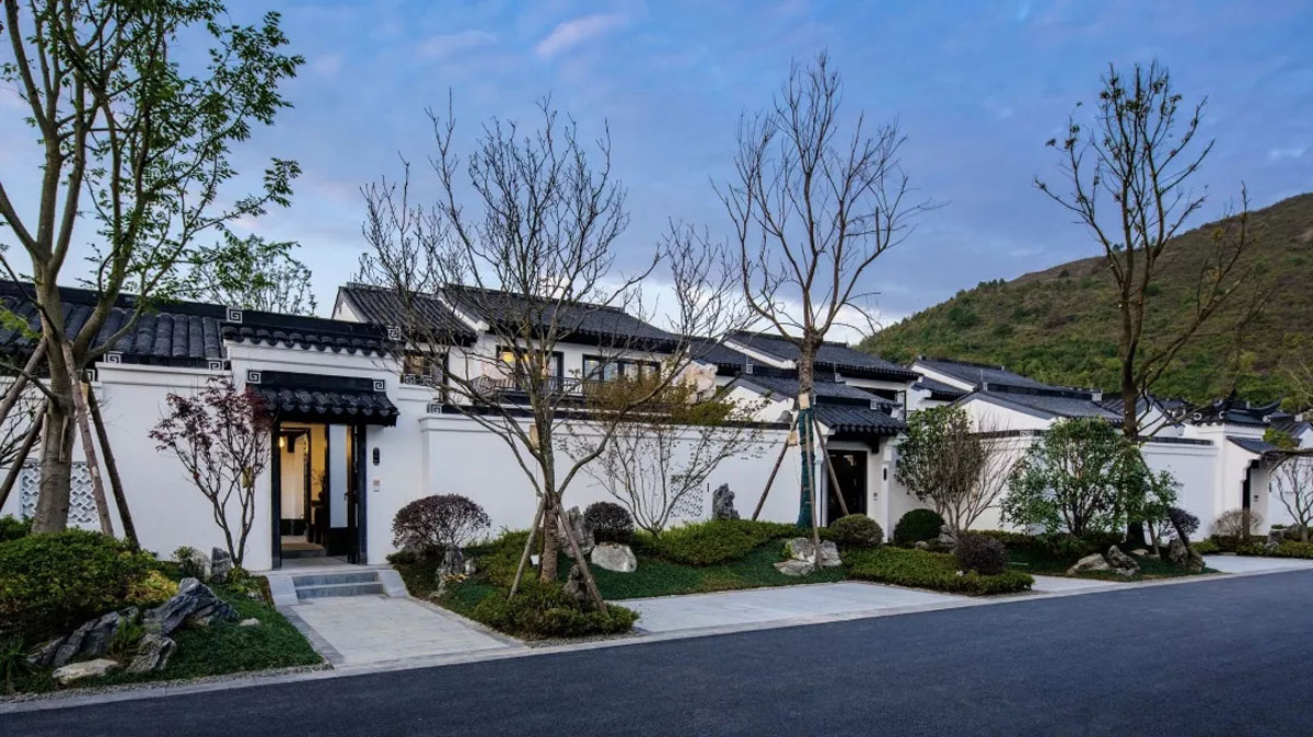 匀山美庐建于彩云之城都匀(今属贵州省)。项目设计从 “如将不尽,与古为新”的审美哲学中汲取慧见,探索、深挖传统中式院落设计的文化精髓,糅合江水、烟波、疏林、雾霭、气韵、云色、日影等自然素材,营造错落有致的古典大宅布局,穿街弄巷、邻里亲近的局部氛围,将庭院、亭台、白墙、青砖、黛瓦、飞檐种种元素美感重构浇筑于一座座院落,清淡、清雅、安居,情致兼具实用,多重庭院过渡与园林式商业街区结合,成就新中式商业住宅典范。