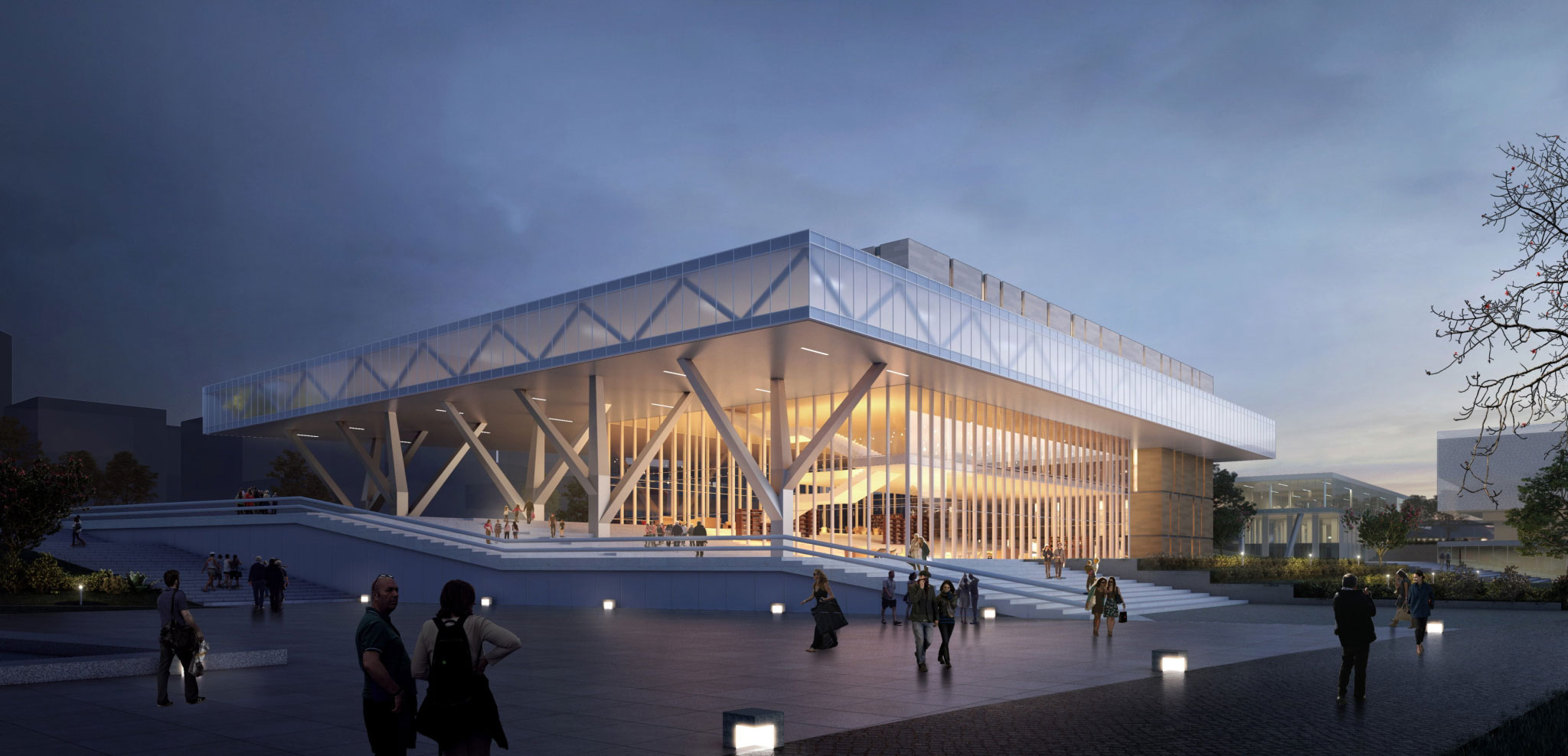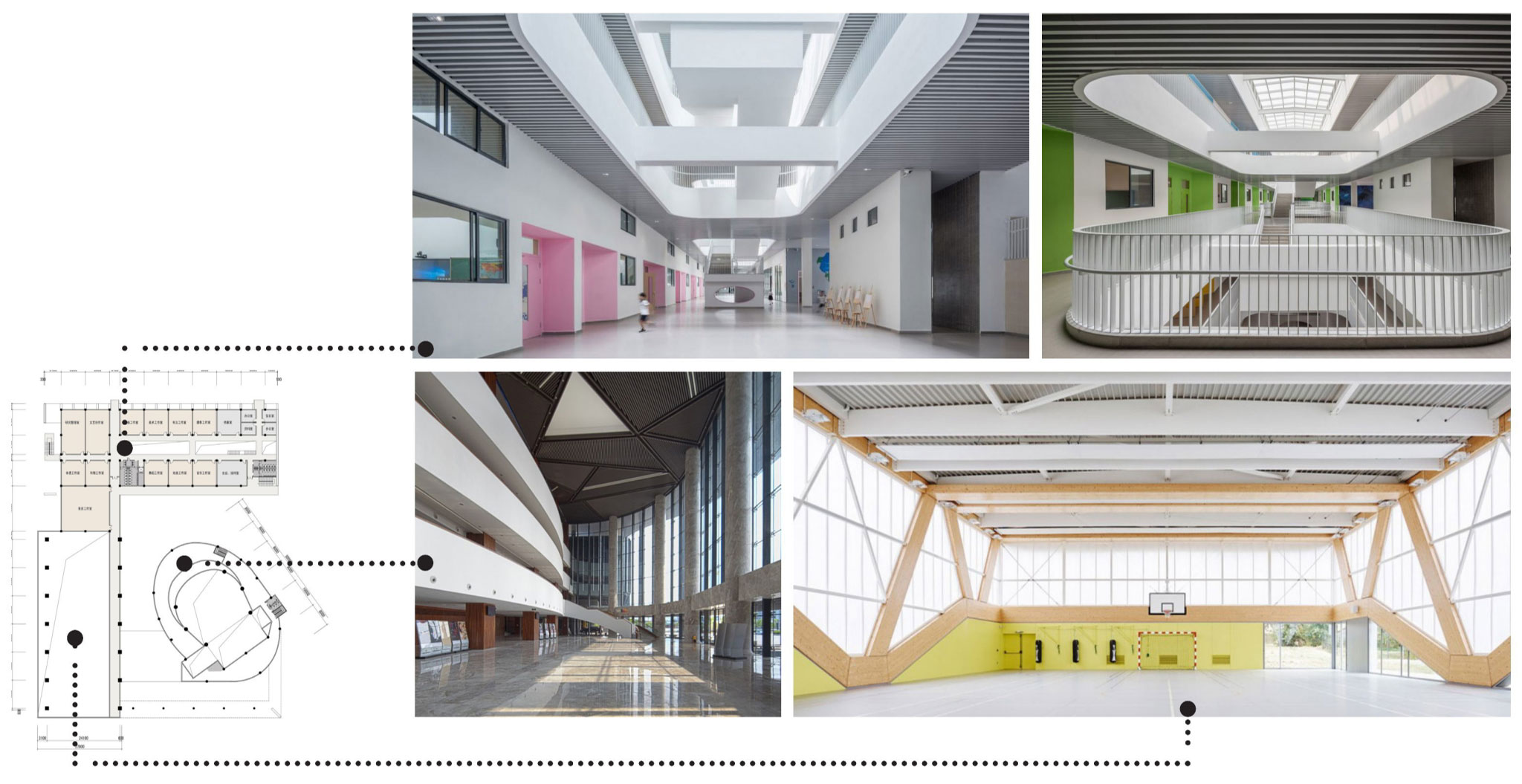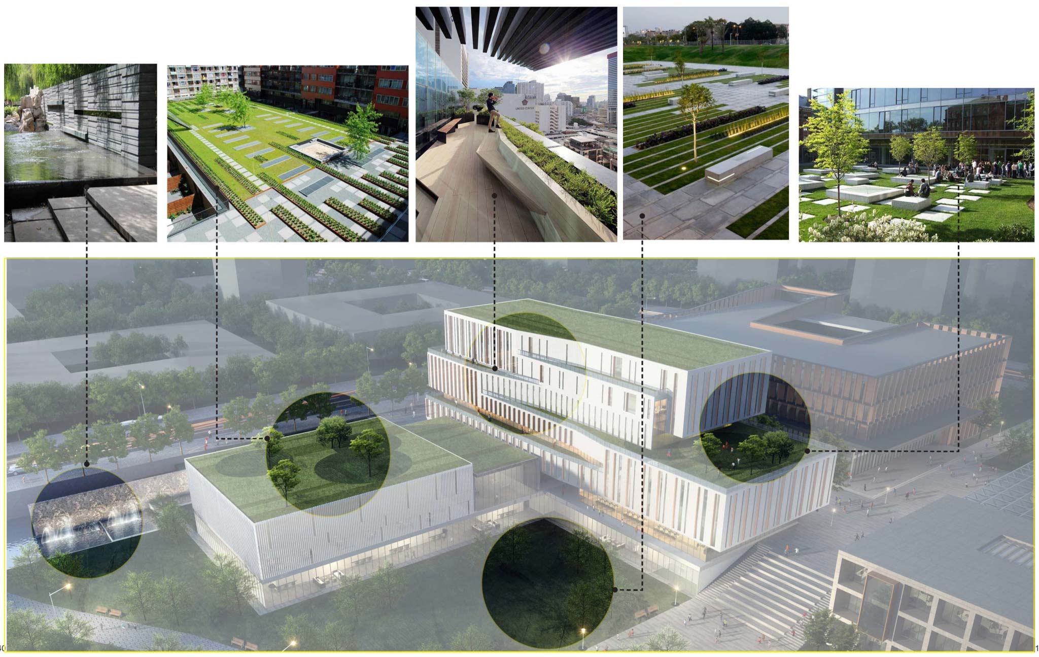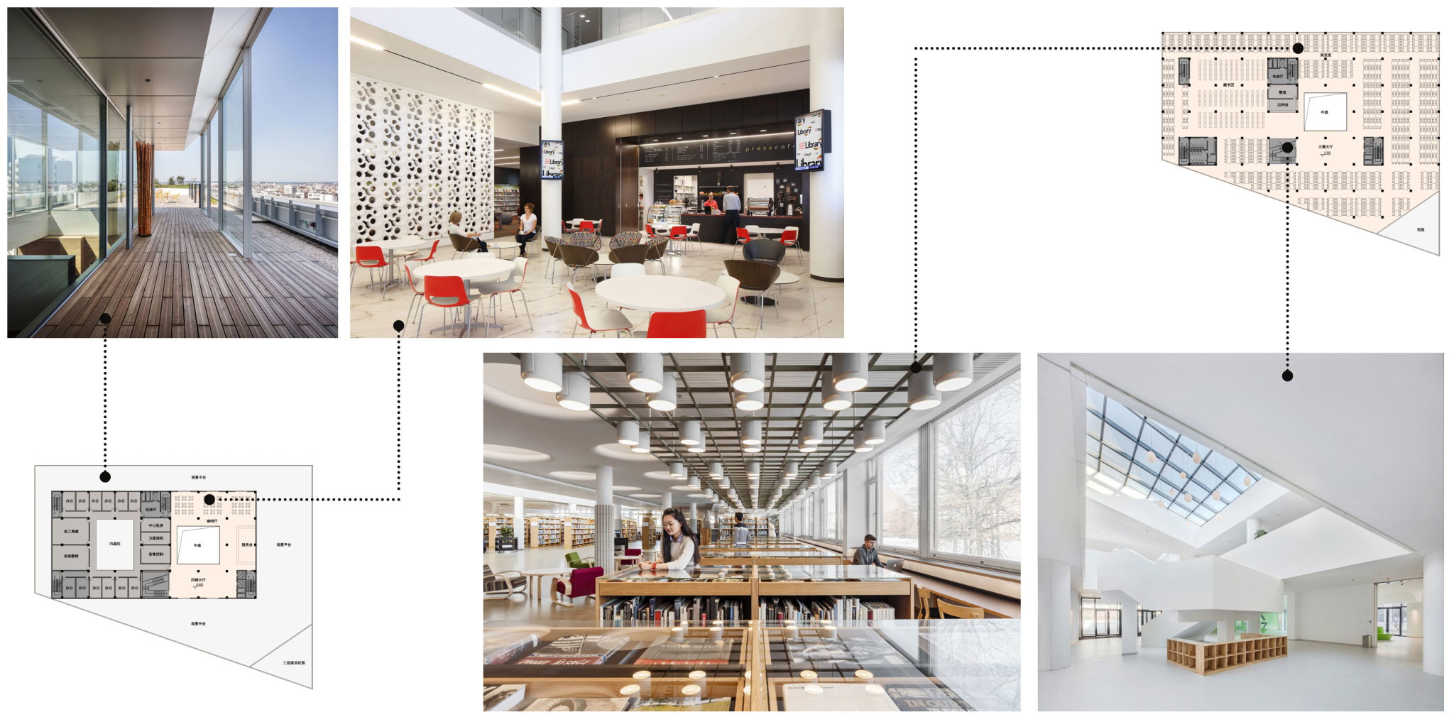项目中的图书馆雏形借鉴与图书有关的“书本”、“书匣”概念,将体量轻盈的书本和厚重的书匣子叠加,不仅注重室内空间的打造,而且在城市关系层面试图呼应城市特色,营造丰富的室外空间。