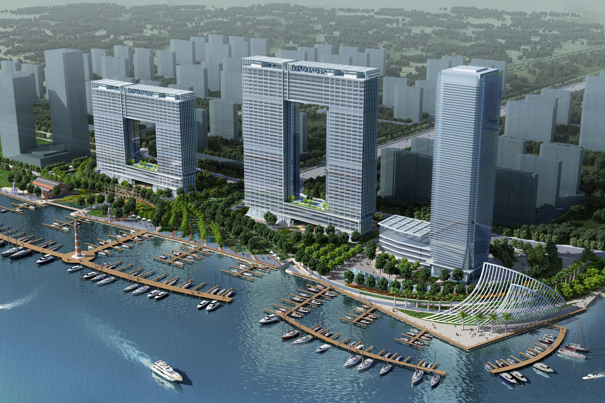 建筑设计方案以城市启航、中交启航为设计理念,营造出积极开放的城市空间和锐意进取的企业文化精神。设计以稳健的群体建筑形态,理性的建筑布局,升腾向上的天际轮廓线,形成千帆竞发、百舸争流的建筑形象,从而塑造了城市南端的新地标,打造出飘逸的城市滨水建筑风景线。