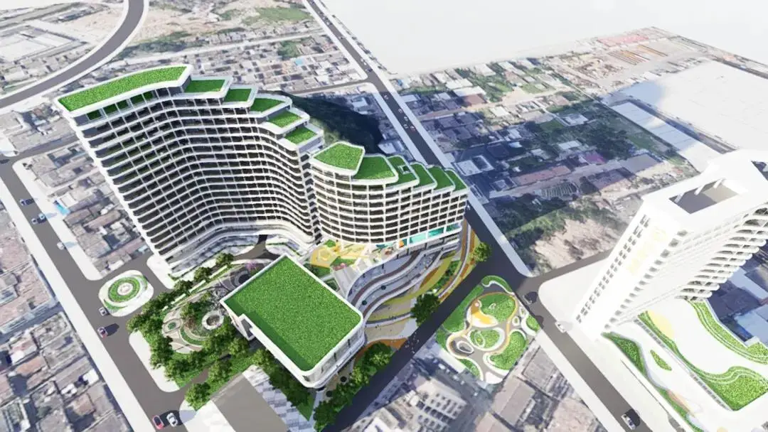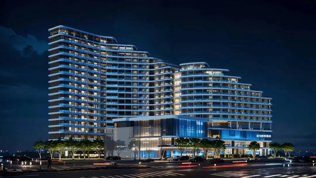 A栋裙房功能多元,集商铺、鱼市、餐厅及宴会厅于一体;4至12层则专注于酒店客房、附属设施与娱乐配套,建筑规模约1.41万㎡。B栋1至3层为酒店专属配套,4至18层为客房区域,建筑规模约2.25万㎡,成功打造集居住、商业、餐饮娱乐于一体的综合性场所。