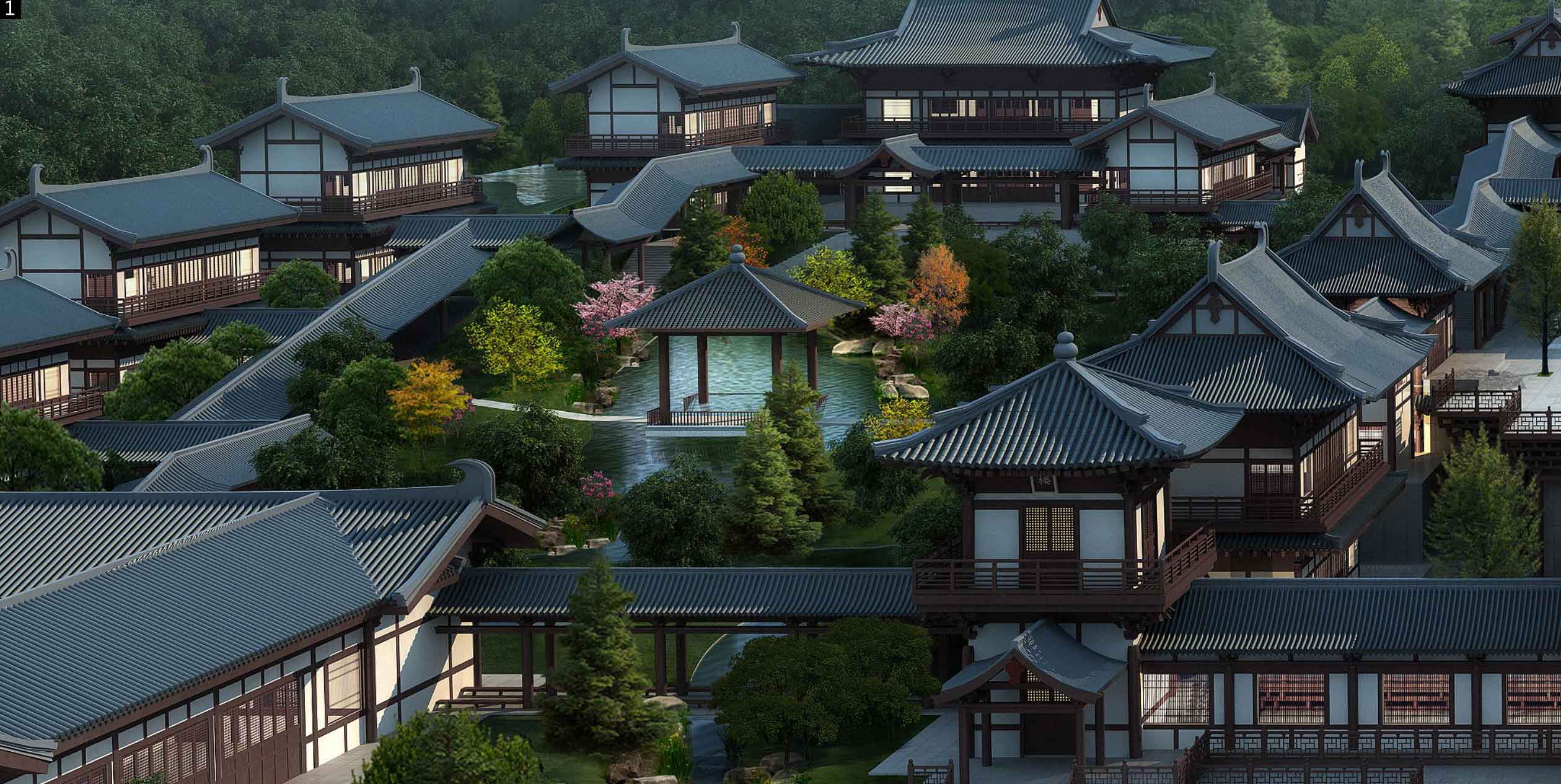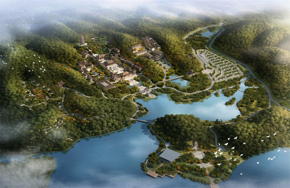 大宸通过生态技术分析将先进节能技术、水循环装置有机应用于山寺宝殿之中,整合场地中的丰富水系形成较为丰富的水网系统,满足生态净化的基本尺度需求。