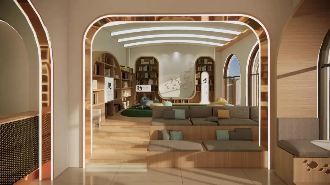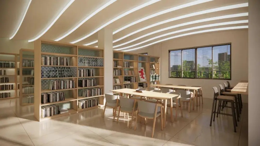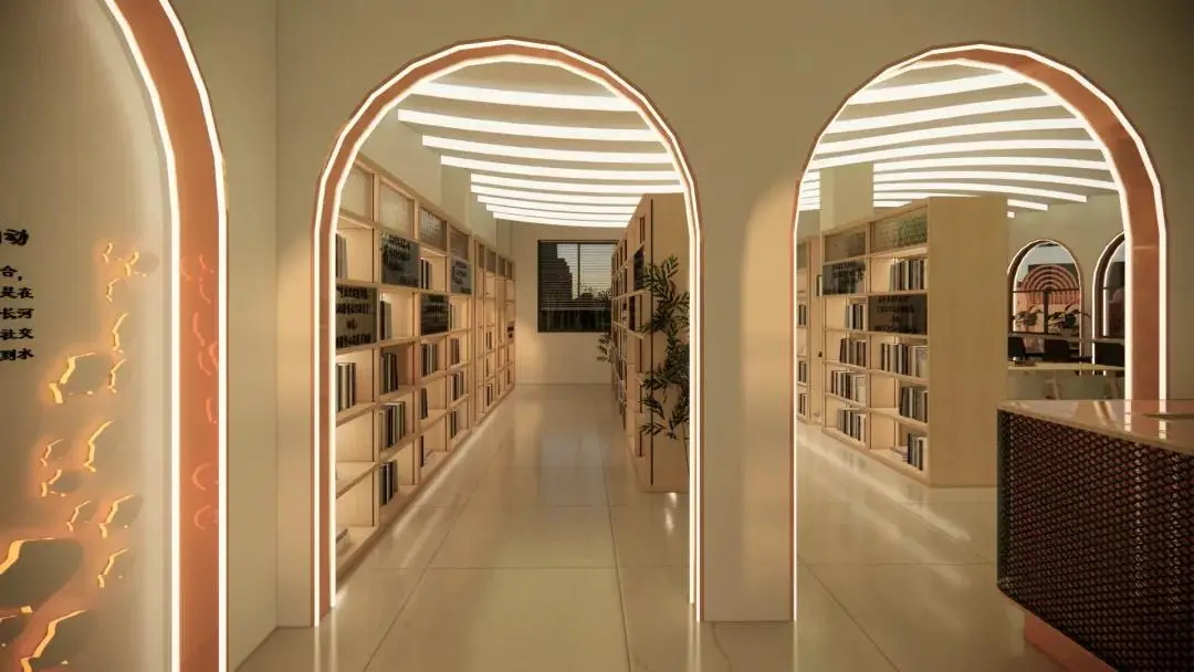 整体设计从“水韵映史,鱼窝新韵·浪潮涌动”的主题出发,充分结合当地文化,以现代创新手法提炼出鱼窝头水乡文化的精髓。特别是在天花设计上,大胆运用波浪曲线,构建出极具韵味的共享社交与阅读空间,营造出如水波荡漾般的灵动氛围,既契合水乡主题,又赋予空间独特的艺术气质,打造出一处现代与传统交融的多功能公共空间。