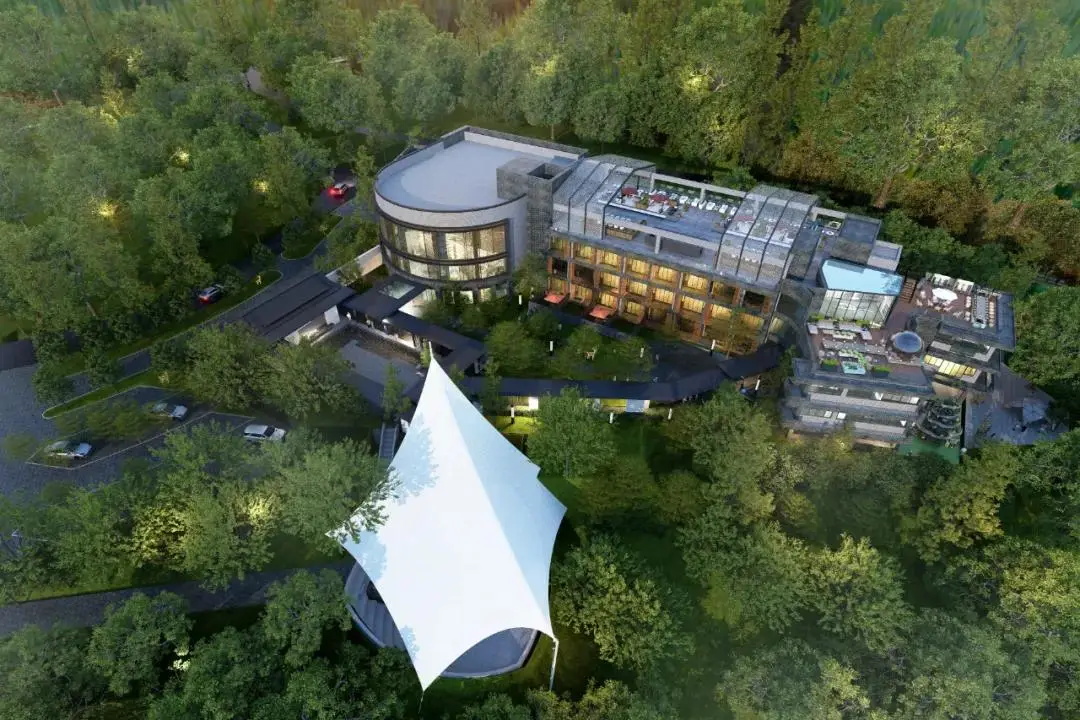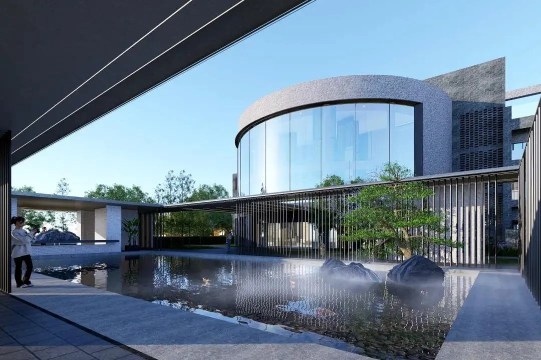 建筑改造采用现代中式风格,以青砖毛石营造中式建筑重色基底,再采用仿木构件、大面积落地玻璃等亮色点缀,形成有机虚实对比,通过直线、弧形、构架等手法突显其明快。整体建筑立面既有传统中式建筑的沉稳大气,又不失现代建筑的灵动活力。