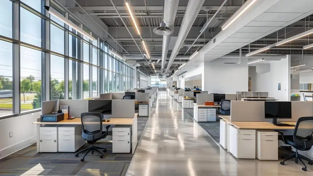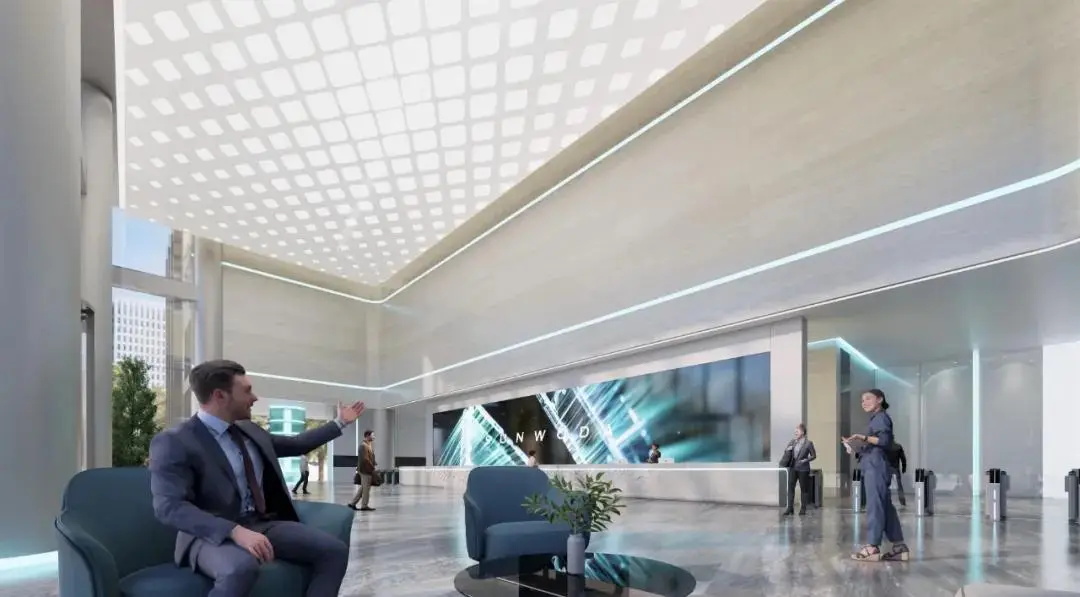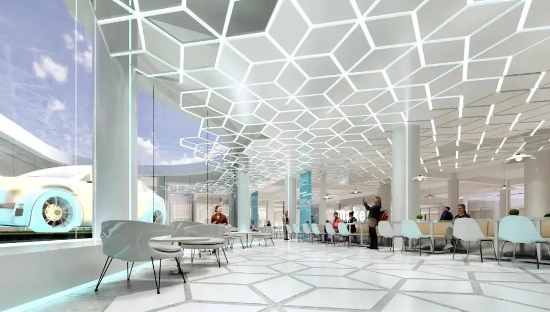 空间设计以智慧社区、绿色能源、未来科技为理念,打造未来智慧工厂。办公大堂运用智慧中枢概念设计,体现科技属性的简洁网格元素纵横交错,推动心理上的情绪切换。天花空间模拟电路板的流畅造型,充分展现品牌基调、诠释企业愿景。