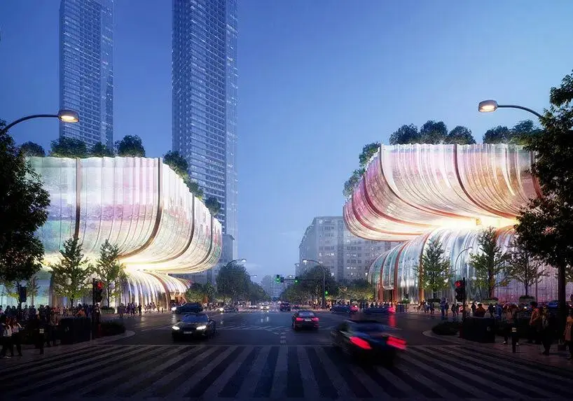 两座建筑都采用了双层表皮,在提供更好的可持续性的同时,也为艺术展览和活动提供了场地。建筑外部的水晶玻璃在白天闪闪发光,给人一种柔和的印象。到了晚上,外表皮则成为发光投影的幕布,充满生机。