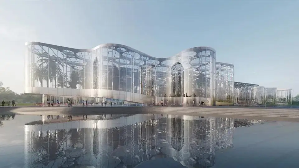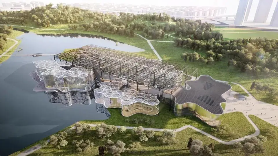 温室花园位于公园中心,坐落在中心湖畔,背靠双子山,总建筑面积约4万平方米,由DMAA设计。该项目深受旧钢铁车间影响,通过“阴阳”思想展现新旧对比,融汇传统与现代、工业与自然等对立元素,营造出独特的优雅氛围。