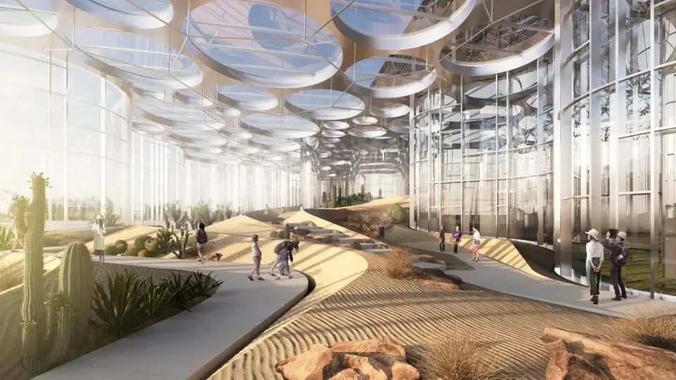 室内精心的空间设计,能够引领游客从沙漠的峡谷和沙丘风光,一路感受到热带雨林的沼泽瀑布、名为云端花园的梯田景观,再到鲜花盛开的花塔。空间尽头,游客还可以参观工厂建筑的屋顶露台,从这里能够俯瞰整个公园的景色,还有周边的城市之景。