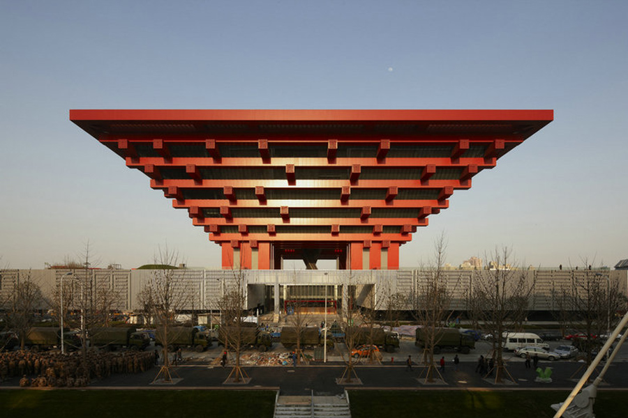 何镜堂设计的上海世博会中国馆,创作构思体现了“东方之冠、鼎盛中华;天下粮仓、富庶百姓”的创作理念。国家馆居中升起、层层出挑、庄严华美,形成凝聚中国元素、象征中国精神的主体造型——东方之冠。地区馆水平展开,汇聚人流,以基座平台的舒展形象衬托国家馆,展现出属于城市、面向世界的中国大舞台形象。