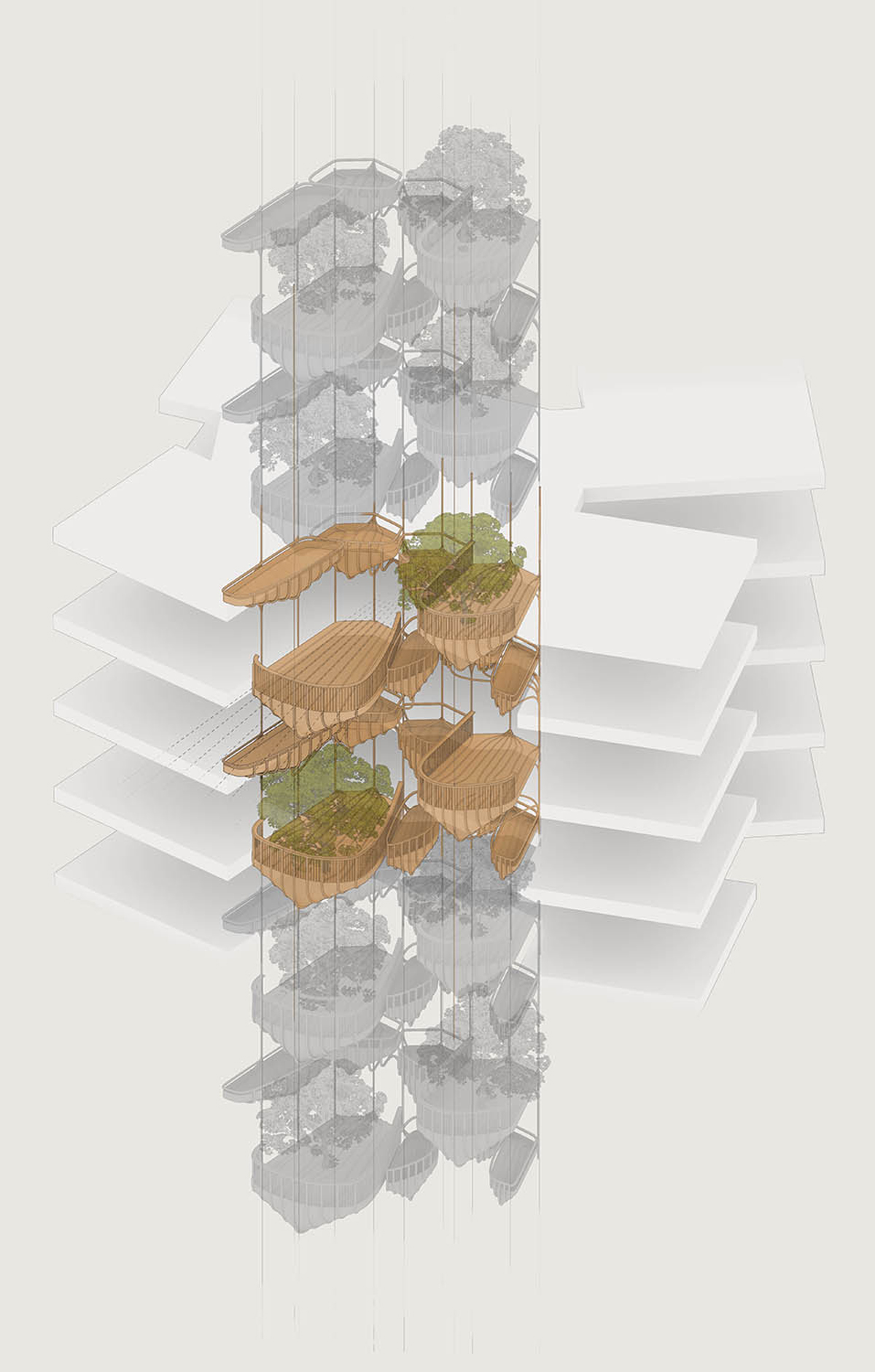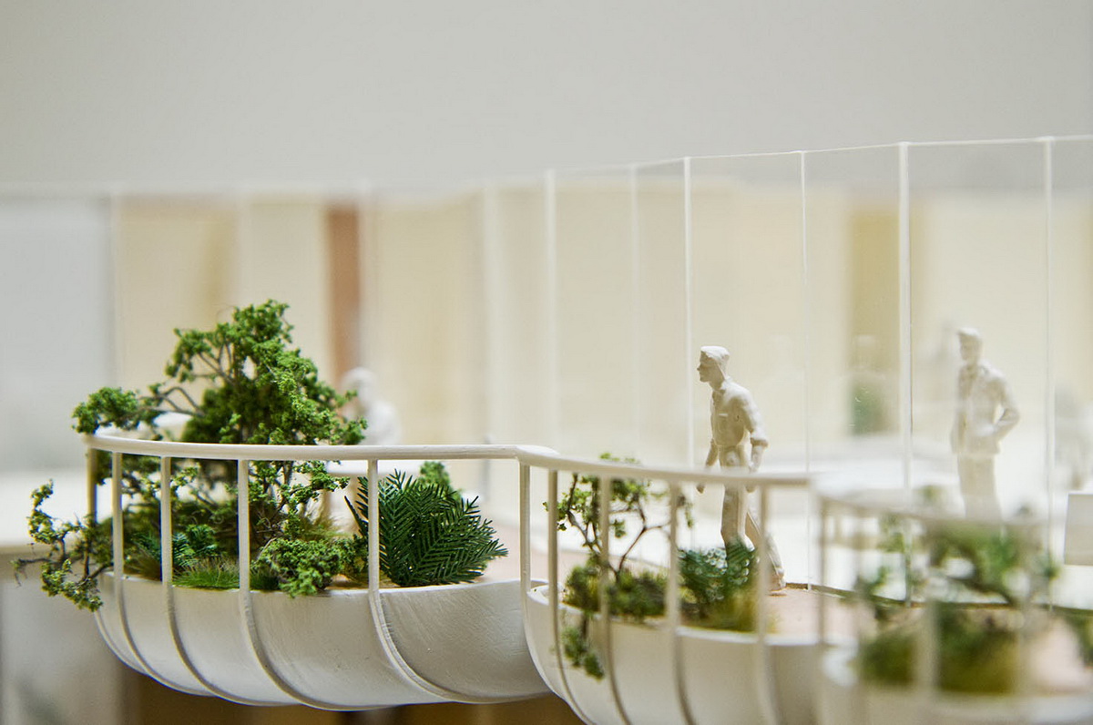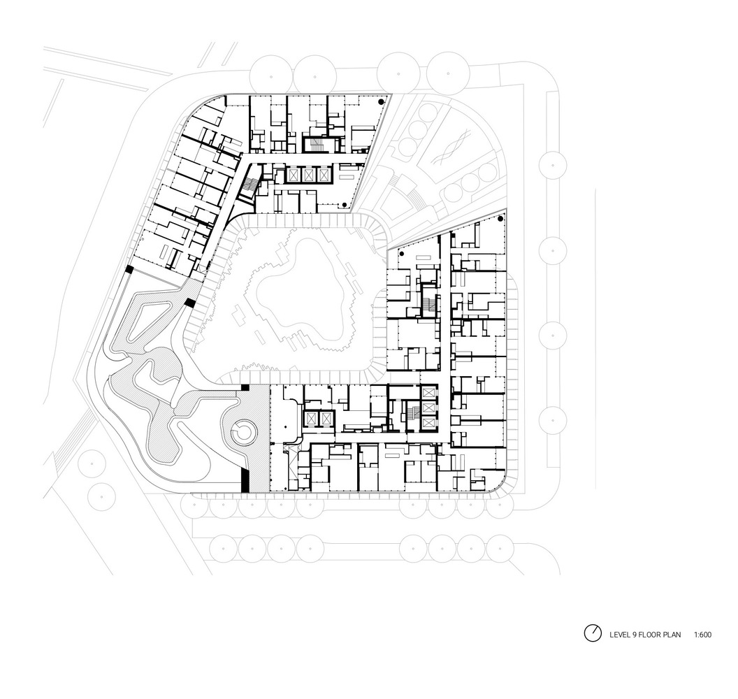 考虑到公众利益,建筑的体块由光塑造。大楼的外形有理可依,流线形体可以减少对周边公共空间受光面的遮蔽。与最初设计方案相比,如今的建筑形式给建在地下的公共广场和图书馆带来了更多的阳光。南侧的梯田式公寓设计有外部露台花园,这种设计可以吸纳更多阳光。梯田式布局有利于交叉通风,雨水收集,合理的公寓组合形式以及公共花园对各类群体皆具有吸引力。