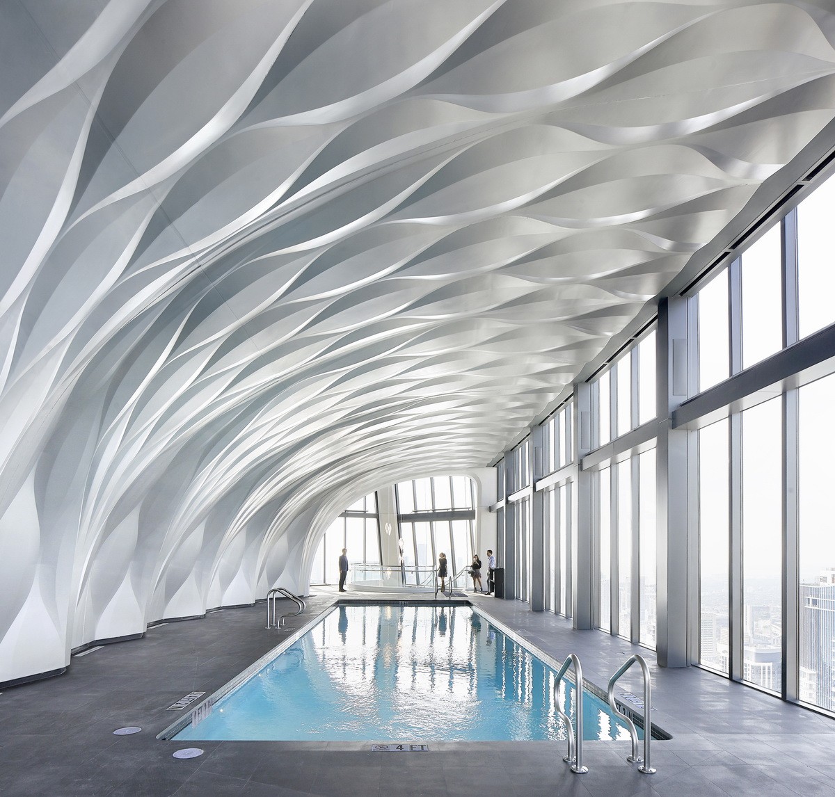 建筑的流线形式和中央的洞口创造出自然采光与通风的通道,建筑与周围环境适度融合,保证了用户的良好体验。一个大型室外游泳池位于洞口的底部,当风吹过这片水域时,它会冷却空气,再将其引入建筑的中心公共庭院。这座大楼可以自由呼吸。