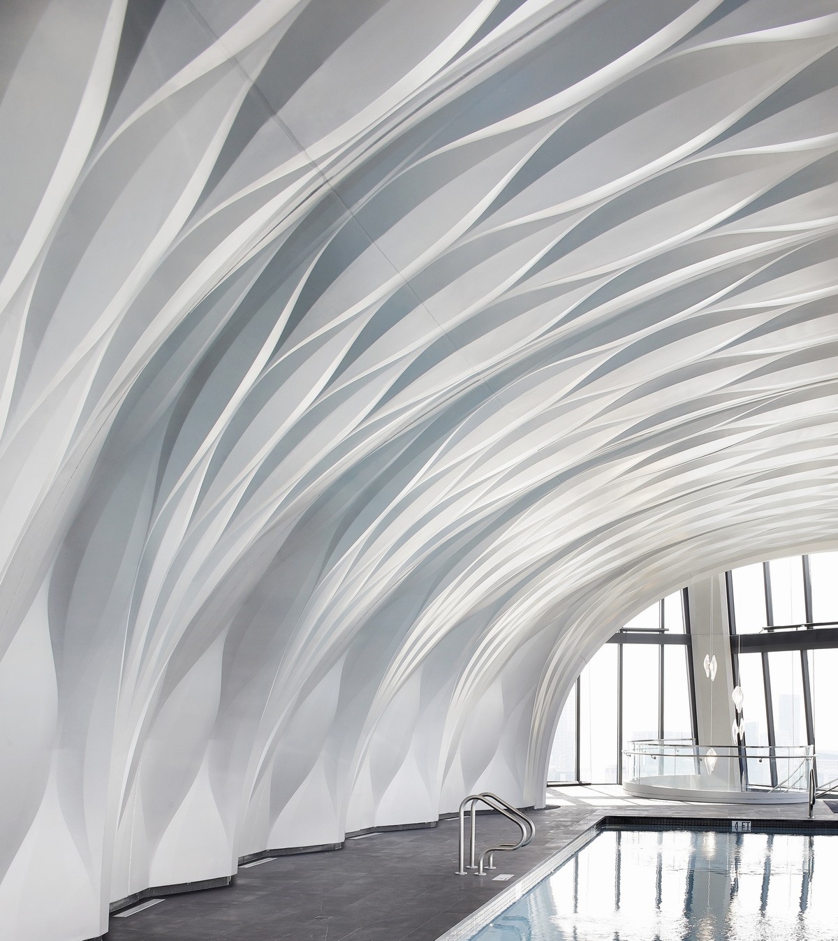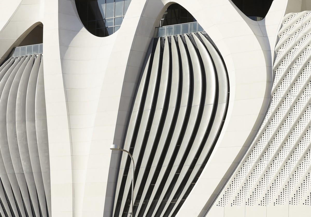 该塔楼延续扎哈·哈迪德建筑事务所(Zaha Hadid Architects)对高层建筑的研究,开创了流体结构与建筑高度一致的新形式。外部流线型网状结构构成了千号馆的混凝土结构骨架,周边结构与主体结构融为一体。